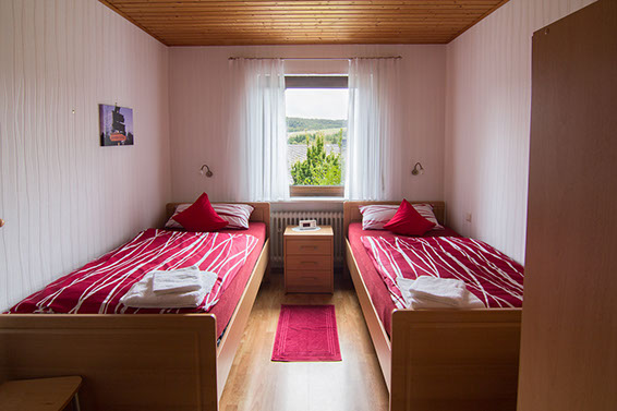 Schlafraum 3 mit zwei separaten Betten, Kleiderschrank und eigenem Waschbecken.