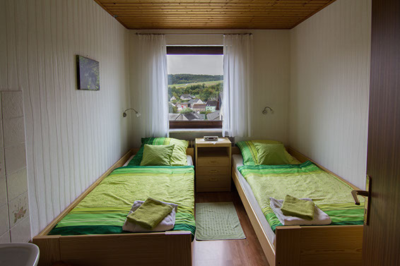 Schlafraum 1 mit zwei separaten Betten, Kleiderschrank und eigenem Waschbecken.