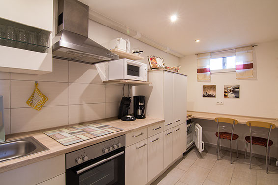 Die geräumige Küche ist komplett ausgestattet mit Kühlschrank, Gefrierschrank, Ceran-Kochfeld und Backofen, Mikrowelle, Spülmaschine, zahl-reichen Küchengeräten wie Kaffeemaschine, Senseo-Pad-Maschine, Wasserkocher und Eierkocher sowie Kochgeschirr und -besteck.