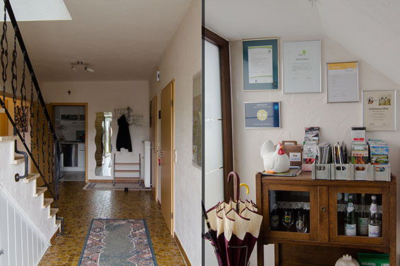 Sie betreten die Ferienwohnung durch einen separaten, ebenerdigen Eingang, der auch für Rollstühle geeignet ist. In der Diele mit Garderobe und Spiegel finden Sie Wanderkarten und Informationsmaterial über die Sehenswürdigkeiten in der Umgebung, Spielplätze, Einkaufsmöglichkeiten, Ärzte etc. ...