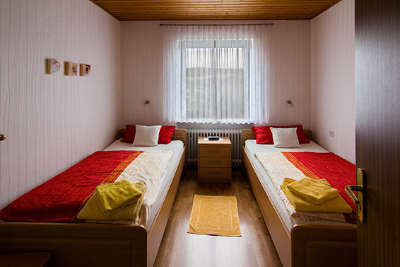 Schlafraum 1 mit zwei separaten Betten, Kleiderschrank und eigenem Waschbecken.