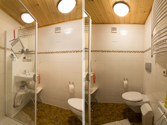 Im zweiten Bad finden Sie eine ebenerdige Dusche, Toilette und Waschbecken. Hier steht Ihnen auch eine Waschmaschine-Trockner-Kombination zur Verfügung.